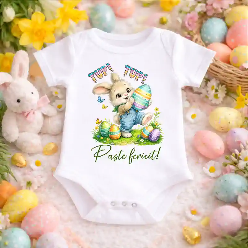 Transformă primul Paște al micuțului tău într-un moment de neuitat cu acest body adorabil cu iepuraș! Designul vesel și jucăuș ilustrează un iepuraș drăgălaș cu un morcov, înconjurat de ouă colorate, alături de mesajul „Tup Tup”, simbolizând energia și bucuria sărbătorilor pascale.