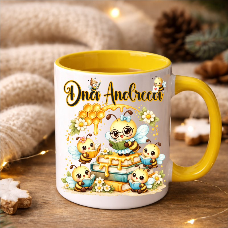 O cană personalizată adorabilă pentru educatoare, cu design tematic „Albinuțele” și posibilitate de personalizare cu nume. Cadoul perfect pentru a-i mulțumi doamnei educatoare.