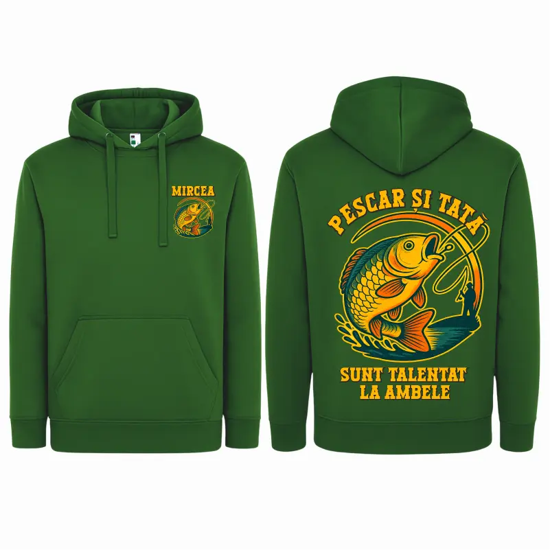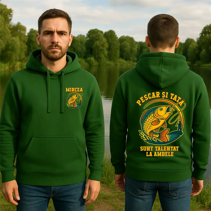 Hanorac personalizat cu textul „Pescar & Tata – Sunt Talentat la Ambele” — combinaţie perfectă de pasiune pentru pescuit și rolul de tată.