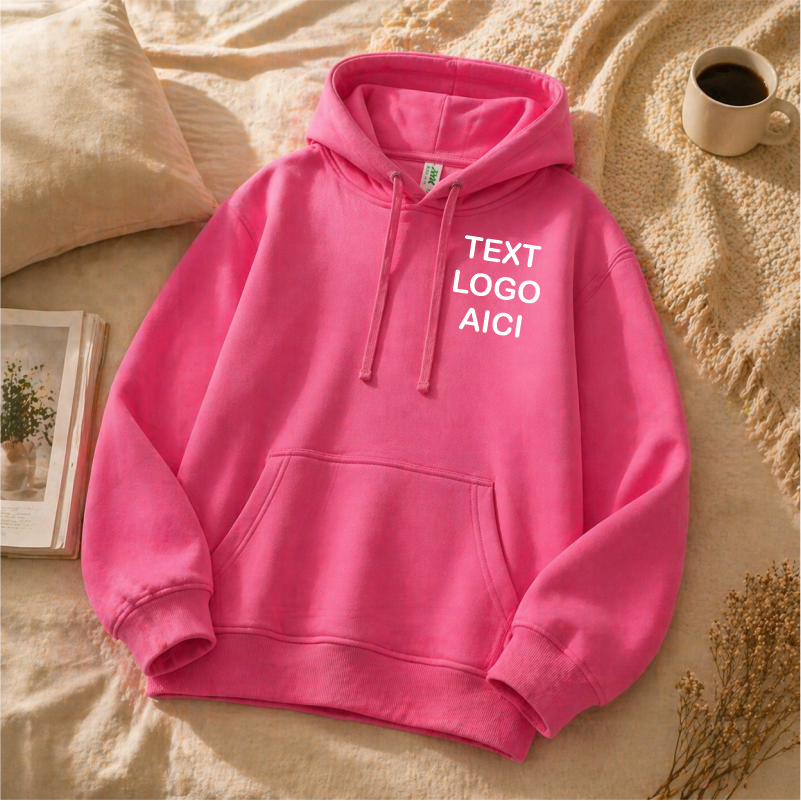 Hanorac roz personalizat cu text sau logo, perfect pentru cadouri, branduri sau ținute unice.