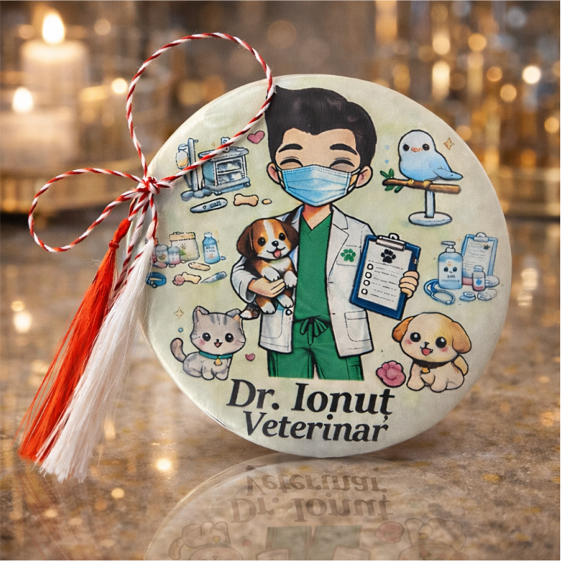 Acest mărțișor personalizat tip insignă pentru medic veterinar este o alegere inspirată pentru a oferi un cadou simbolic, dar relevant profesional. Designul cu tematică veterinară reflectă respectul și aprecierea pentru profesioniștii care se ocupă de sănătatea și bunăstarea animalelor.