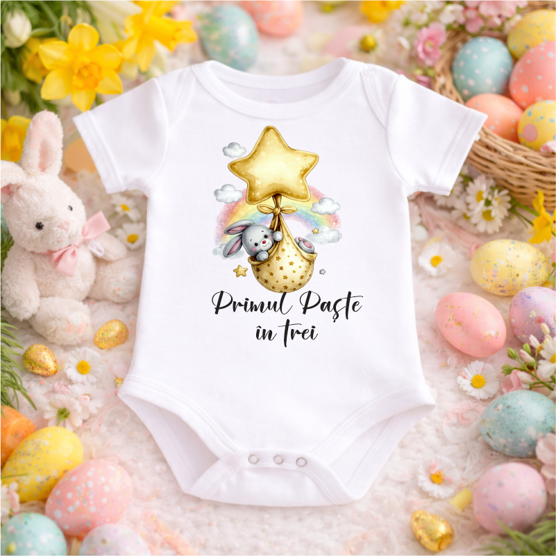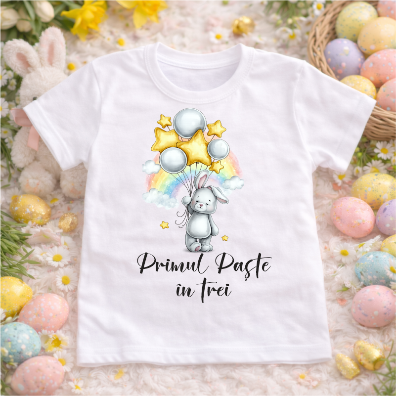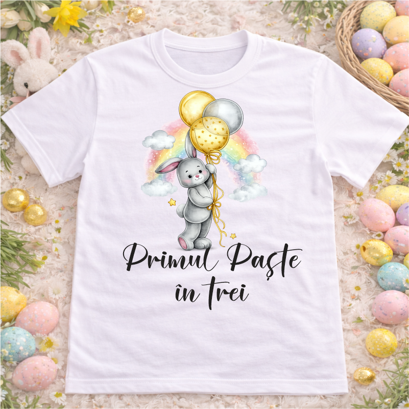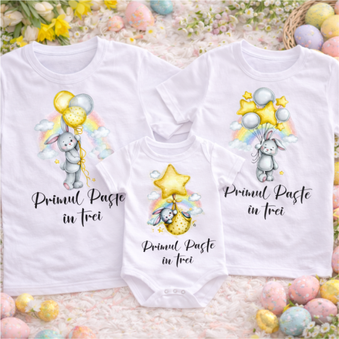 Celebrează primul Paște al micuțului vostru cu un set de tricouri perfect pentru întreaga familie! Cu un design adorabil ce include trei iepurași și mesajul "Primul Paște în 3", acest set este ideal pentru poze de neuitat și momente speciale alături de cei dragi.