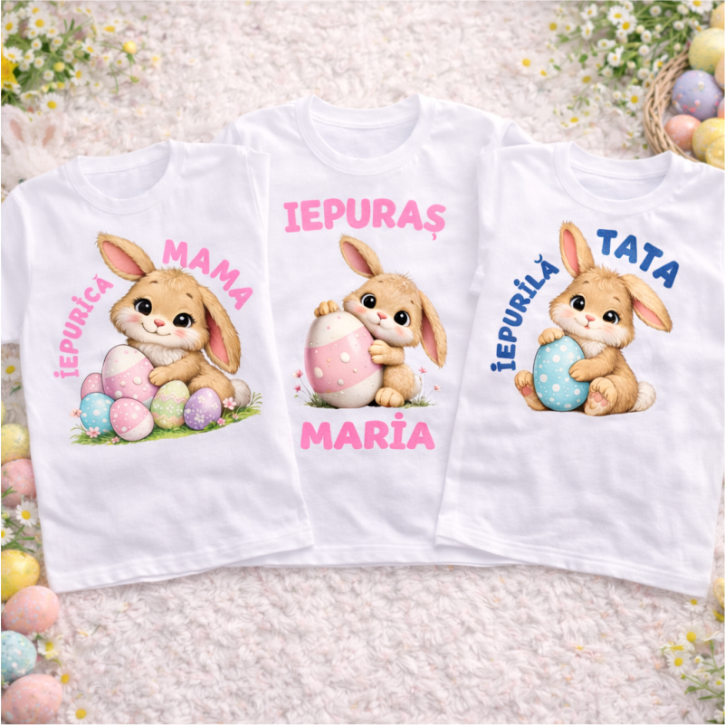Set tricouri pentru mama, tata si copil, personalizate cu "Tata Iepurilă, Mama Iepurică, Iepuraș Maria"